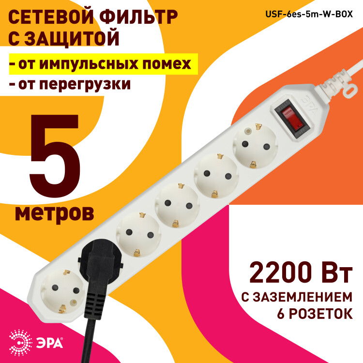 Сетевой фильтр ЭРА USF-6es-5m-W обладает несомненными достоинствами, позволяющими ему стать необходимым атрибутом современного дома. Прочный корпус универсального цвета имеет 6 розеток, каждая из которых имеет заземление. Длина его провода составляет 5 метров, что особенно удобно в пределах одной комнаты. Функционируя как удлинитель, сетевой фильтр ЭРА исключит большое количество лишних проводов. При использовании фильтра можно быть спокойным за технику, ведь он защищает, короткого замыкания, фильтрует импульсные помехи. При этом мощность фильтра составляет 2200 Вт, что обеспечивает безопасную и бесперебойную работу техники. Сетевые фильтры ЭРА разрабатываются собственным техническим бюро, проходит проверку на всех этапах производства, что обеспечивает высокое качество продукта.