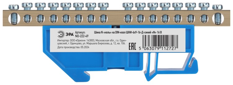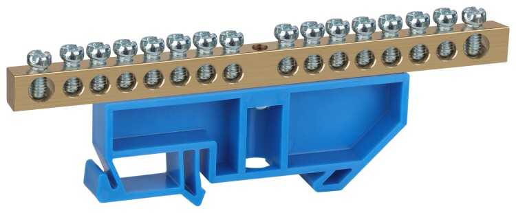 Шины латунные N «нейтраль» 6×9 на DIN-изоляторе применяются для электрического и механического соединения нулевых, защитных и фазных проводников в электрических щитах и распределительных устройствах. Изделия выполняются из латуни соответствующего сечения с отверстиями, обладающими винтовыми зажимами для подключения проводников. Шины установлены на пластиковый изолятор, изготовленный из полипропилена с добавлением антипиренов. Конструкция изолятора обладает креплением для установки на DIN-рейку. Цвет изолятора (синий/жёлтый) позволяет быстро и правильно идентифицировать тип подключаемого проводника.