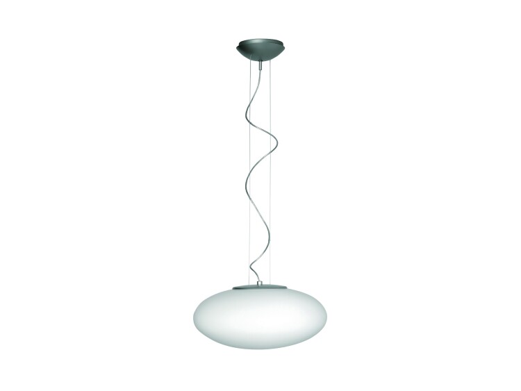 Подвесной светильник, создающий диффузное освещение. Рассеиватель из выдувного трехслойного опалового стекла ручной работы. Потолочная чашка из окрашенного в цвет серый металлик (RAL 9006) металла.