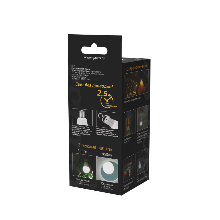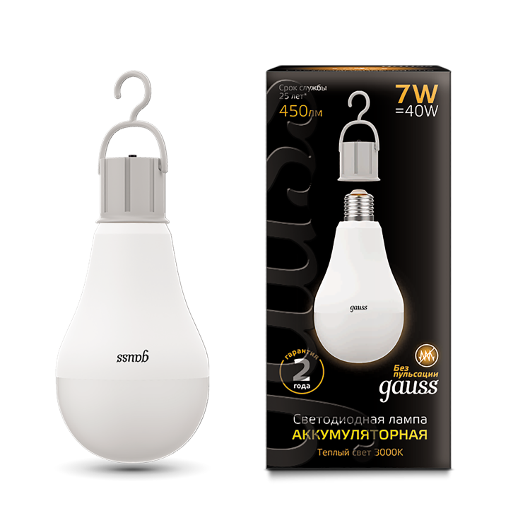 Лампа Gauss A60 оснащена Li-Ion аккумулятором, что позволяет использовать ее не только в сети, но и в автономном режиме. Благодаря светодиодной технологии, эта лампа не только экономит электроэнергию, но и долговечна, обеспечит много часов работы.