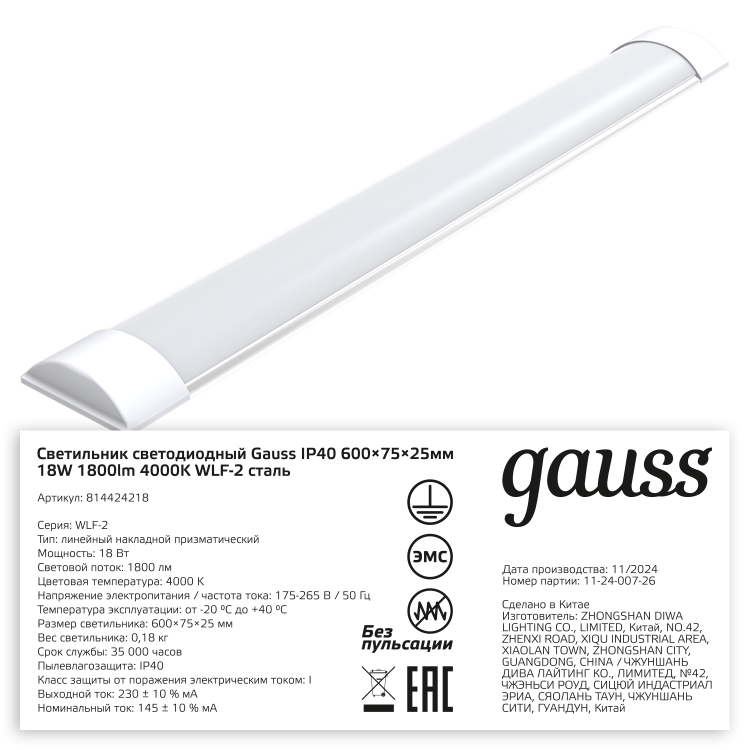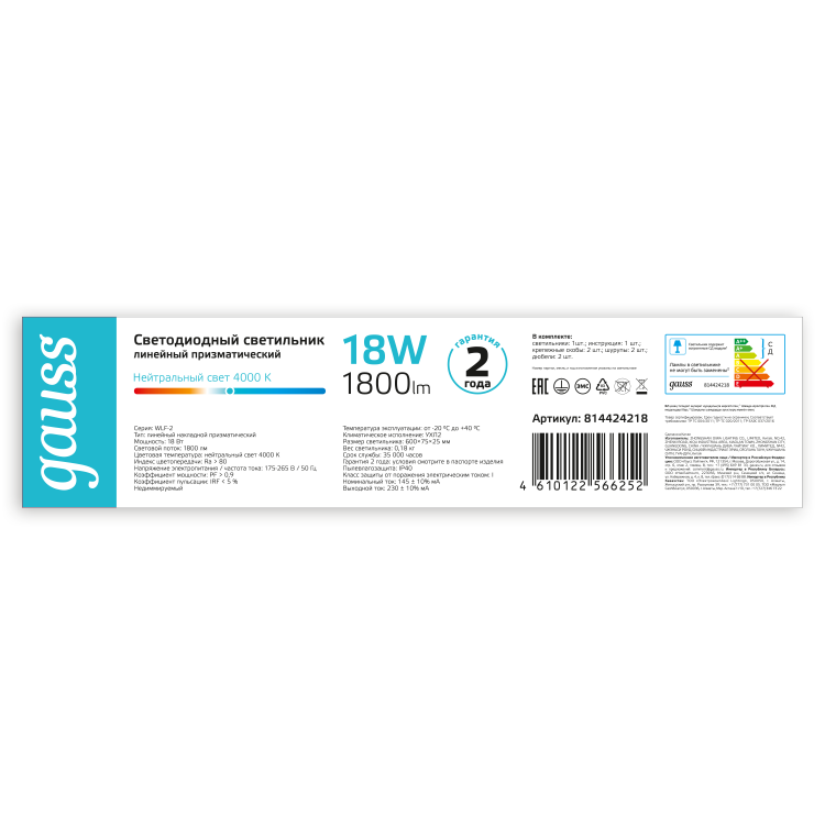Светильник светодиодный матовый Gauss WLF-2 в стальном корпусе с мощностью 18w, яркостью светового потока 1250лм и цветовой температурой 4000К (нейтральный белый свет). У него высокий КПД благодаря качеству светодиодов Sаnan снабженных радиатором из алюминия. Этот светильник - отличный бюджетный вариант для освещения зданий коммерческого, общественного и жилого назначения. Прекрасно подойдет для любых сухих помещений без повышенных требований к пылевлагозащите, таких как основные помещения, а так же лестничные площадки, межэтажные пространства, коридоры, подсобные и гардеробные помещения.