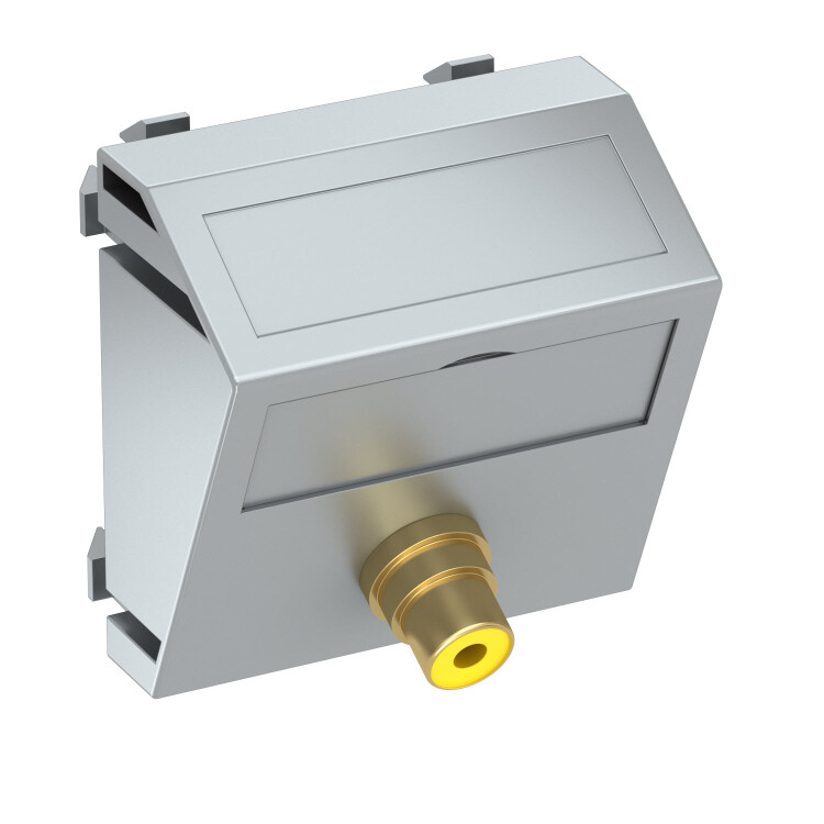 Корпус с разъемом тюльпан для Composite Video, наклонный кабельный вывод, с полем для надписи, гнездо тюльпан (RCA) с подключением пайкой, цветовая кодировка желтая.Суппорт с растровым креплением подходит для горизонтального и вертикального монтажа.