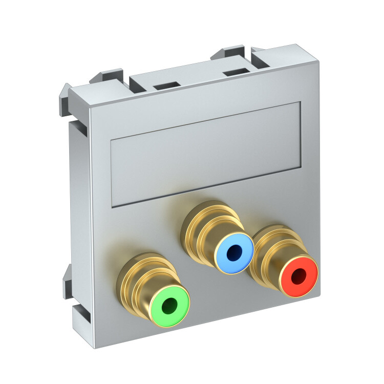 Корпусс тремя разъемами тюльпан для Component Video, прямой кабельный вывод, с полем для надписи, три гнезда тюльпан (RCA) с подключением пайкой, цветовая кодировка красный/зеленый/синий.Суппорт с растровым креплением подходит для горизонтального и вертикального монтажа.