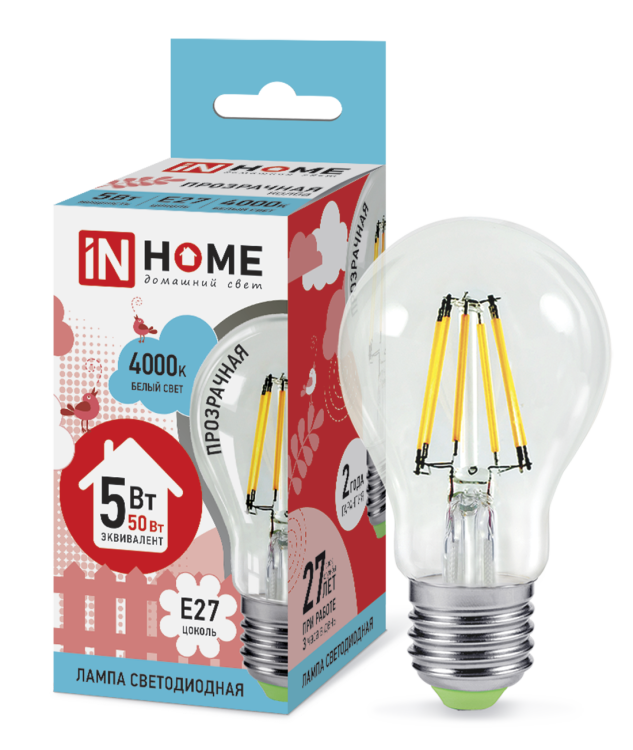 Лампа светодиодная LED-A60-deco 5Вт 230В Е27 4000К 450Лм прозрачная IN HOME (кр.50шт)