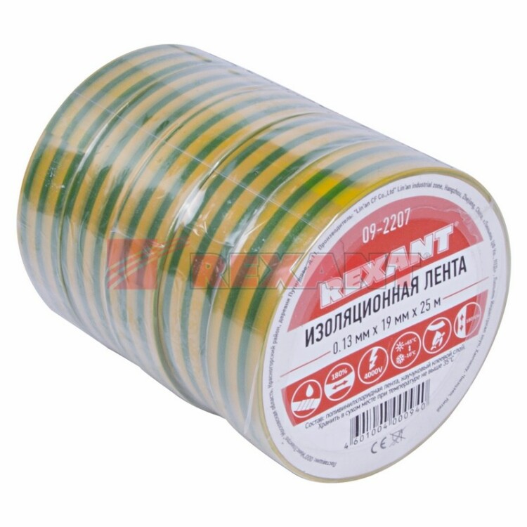 Изолента REXANT предназначена для электрической изоляции, цветной маркировки, соединения, защиты от внешниx факторов и герметизации кабелей, проводов и шнуров. Состав: Лента ПВХ, клеевой слой.Размер: Ширина 19 мм; Длина 25 м; Толщина 0,13 мм.Характеристики:Напряжение: до 6000 В.Растяжение: до 180 %.Температура использования: -30...+50 °С.Не поддерживает горение.Устойчива к УФ, слабым растворителям и солям.Изолента желто-зеленого цвета в соответствии с требованиями ГОСТ Р50462 используется для обозначения заземления.