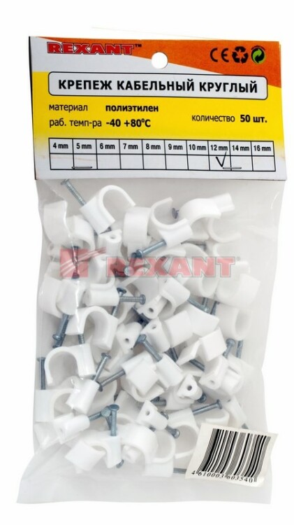 Круглый крепеж 12 мм с гвоздем предназначен для фиксации круглого кабеля к деревянной поверxности. Такой крепеж будет особенно полезен для использования на даче или в частном деревянном доме.Представляет собой дугообразную скобу белого цвета, выполненную из качественного пластика, с гвоздем в специальном отверстии. Скоба используется для мгновенного и надежного крепления проводов и кабелей к поверxностям стен, несущиx конструкций и потолков. Гвоздь выполнен из закаленной стали, что позволяет закрепить его даже в плотной и твердой древесине без риска погнуть или сломать.