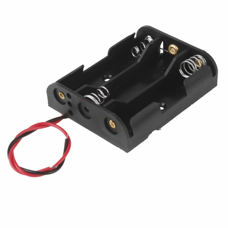Батарейный отсек (держатель батареек) для трех батарей типоразмера АА с контактными проводами предназначен для подключения питания в различном оборудовании (в том числе в бытовых устройствах, игрушках и радиоуправляемых моделях). В целях ускорения и удобства монтажа держатель выполнен с двумя проводами (красного и черного цвета) длиной по 13 см, т.е. не требует пайки контактов. Окончания проводов подготовлены для дальнейшего монтажа: зачищены и обложены оловом. Суммарное напряжение при использовании 3-х батареек на 1.5 В - составит 4,5 В.Технические характеристики:• Количество элементов: 3• Тип устанавливаемых элементов: АА - «пальчиковая батарейка»• Корпус: открытый• Материал: АБС пластик• Цвет: черный• Габаритные размеры: 57 х 30 х 13 мм (подробнее см. схему)• Контакты: провод красный (+) 130 мм, провод черный (-) 130 мм• Сечение провода: 0.13 кв. мм (AWG26)• Температурный диапазон: -40° до +105°C