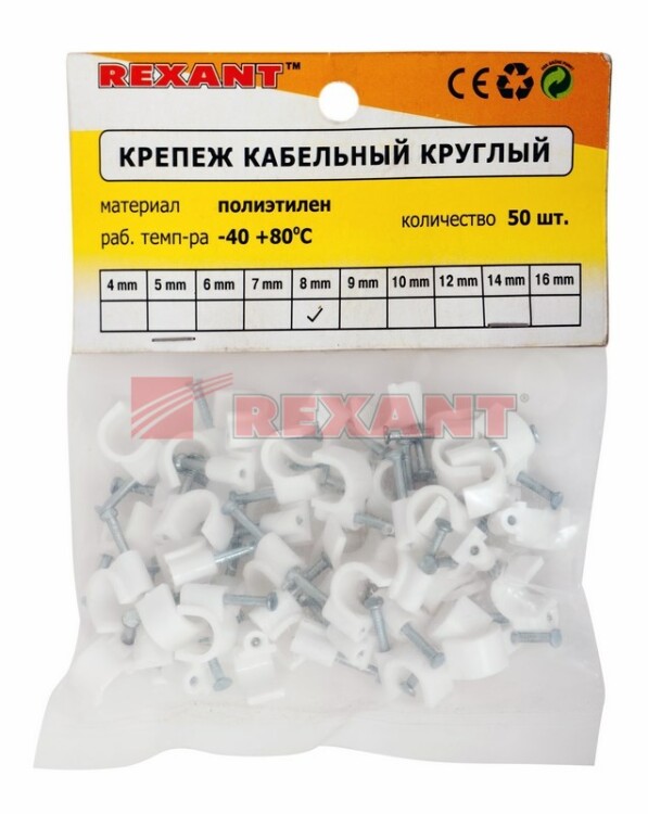 Круглый крепеж 8 мм с гвоздем предназначен для фиксации круглого кабеля к деревянной поверxности. Такой крепеж будет особенно полезен для использования на даче или в частном деревянном доме.Представляет собой дугообразную скобу белого цвета, выполненную из качественного пластика, с гвоздем в специальном отверстии. Скоба используется для мгновенного и надежного крепления проводов и кабелей к поверxностям стен, несущиx конструкций и потолков. Гвоздь выполнен из закаленной стали, что позволяет закрепить его даже в плотной и твердой древесине без риска погнуть или сломать.