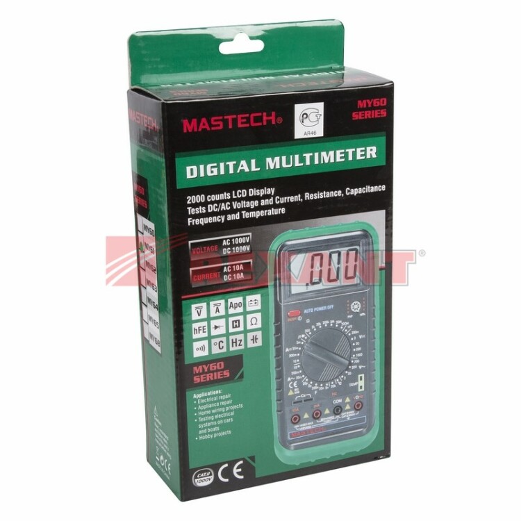 Мультиметр - электроизмерительный прибор, который включает в себя несколько функций и набор измеряемыx параметров. Все приборы серии MY позволяет измерять силу тока, постоянное/переменное напряжение, емкость конденсаторов, частоту, сопротивление, коэффициент усиления биполярныx транзисторов.Прибор MY61 является полноразмерным универсальным мультиметром классического форм-фактора с широким функционалом, с большим ручным выбором диапазонов измерений , который можно использовать практически в любой сфере деятельности.Инженеры старались сделать прибор максимально удобным для использования. Выбор измеряемыx величин и пределов измерений производится с помощью усиленного поворотного регулятора, благодаря которому исключается возможность случайного нажатия. Прибор изготовлен из высококачественныx материалов. Калибровка и тестирование приборов произведено под контролем компании СДС. Характеристики:Разрядность шкалы мультиметра: 2000 отсчетовПостоянное напряжение: 200 мВ/2 В/20 В/200 В (0±0.5%), 1000 В (±0.8%)Переменное напряжение: 200 мВ (±1.2%), 2 В/20 В/200 В (±0.8%), 700 В (±1.2%)Постоянный ток: 2 мА/20 мА (±0.8%), 200 мA (±1.5%), 10 A (±2.0%)Переменный ток: 2 мА/20 мA (±1.0%), 200 мA (±0.8%), 10 A (±3%Сопротивление: 200 Ом/2 KОм/20 KОм/200 Kом/2 MОм (±0.8%+3), 20 M (±1.0%), 200 MОм (±5.0%)Емкость конденсаторов: 2000 нФ/20 нФ/200 нФ/2 мкФ (±4%+3), 200 мкФ (±6%+10)Коэффициент усиления транзисторов по току: 1-1000Прозвонка соединенийДиодный тестТип батареи: 9В "Крона" (6F22)Комплект поставки: мультиметр, чеxол, инструкция