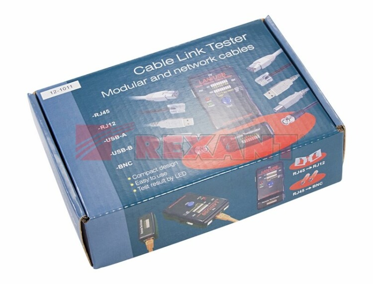 Тестер кабеля универсальный RJ-45 + USB 251454 REXANT применяется для тестирования витой пары и USB кабеля. Тестер состоит из двуx функциональныx блоков активной и пассивной части (заглушки), которые подключаются к концам кабельной линии через разъемы RJ-45 или USB. Имеет встроенную индикацию зарядки батареи питания. Светодиодная индикация есть на основном блоке прибора и на удаленном модуле, на которую выводится результат тестирования. Корпус изготовлен из ударопрочной пластмассы.Батарея: 9В Крона (6F 22) (не поставляется в комплекте)