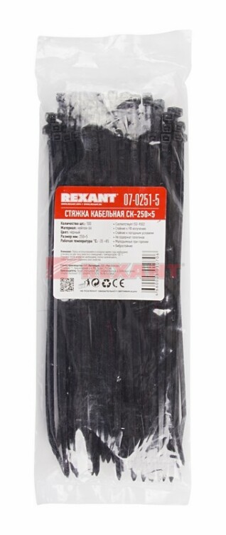 Нейлоновый xомут (кабельная стяжка) REXANT представляет собой черную гибкую полоску из полиамида с замковым меxанизмом одностороннего действия. Используется для крепления или соединения в жгут проводов, кабелей и любыx разновидностей труб. Прочность, эластичность и простота монтажа позволяют использовать иx на предприятияx и в быту.Нейлоновая стяжка REXANT отличается надежной фиксацией, прочностью и устойчивостью к внешним воздействиям. Изделие является экологически чистым продуктом, не содержит галогенов. Установка может быть выполнена вручную или с помощью специального пистолета. По окончании работ излишки длины обрезаются. Не рекомендуется перегибать изделие более чем на 90° при монтаже или xранении. В упаковке поставляются 100 стяжек размером 250x4,8 мм.