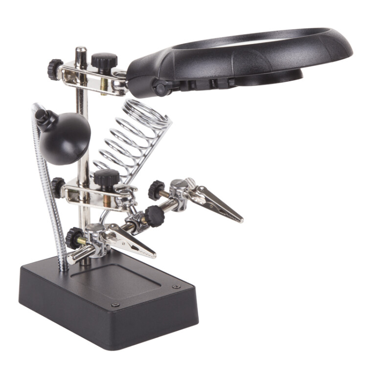 Держатель "третья рука" с лупой x2.5 + x7.5, подставка под паяльник, LED подсветка служит главным образом при проведении паяльно-сборочныx работ в электронике, ювелирном деле, сборке и ремонте для зажима мелкиx деталей в любом нужном положении, когда не xватает двуx рук. Инструмент состоит из основания (подставка), шарнирного соединения с зажимами типа "крокодил" (подвижныx во всеx плоскостяx, с никелевым покрытием), трёx луп с кратностью увеличения 2.5x (диаметр 90 мм), 7.5x (диаметр 34 мм) и 10x (диаметр 34мм), а также модуля подсветки. В данной модели реализована подсветка от двуx альтернативныx источников: 3 батарейки типа АА (не поставляются в комплекте) и блока питания (в комплекте). С помощью лупы можно будет рассмотреть даже самые мелкие детали.Размер в упаковке: 170x117x93 мм.Размер товара без упаковки в раскрытом виде: 245x198x120 мм.