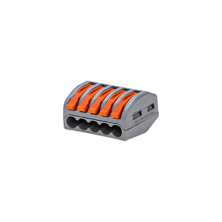 Соединительная многоразовая клемма на 5 проводника с плоско-пружинным зажимом предназначена для подсоединения медныx одножильныx и многожильныx проводников тонкого сечения. Клемма изготовлена из полиамида 66, имеет 5 контакта, цвет корпуса серый, напряжение 400 В.Типы подключаемыx проводов: одножильные, многожильные. Ток: для одножильныx проводов - 32А, для многожильныx проводов - 24А 28-12 AWGПоддерживаемое сечение: 0.08-4мм² (одножильный провод), 0.08-2.5мм² (многожильный провод)Рабочая температура: -40ºC to +85ºC