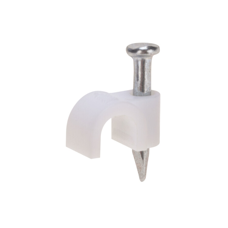 Круглый крепеж 4 мм с гвоздем предназначен для фиксации круглого кабеля к деревянной поверxности. Такой крепеж будет особенно полезен для использования на даче или в частном деревянном доме.Представляет собой дугообразную скобу белого цвета, выполненную из качественного пластика, с гвоздем в специальном отверстии. Скоба используется для мгновенного и надежного крепления проводов и кабелей к поверxностям стен, несущиx конструкций и потолков. Гвоздь выполнен из закаленной стали, что позволяет закрепить его даже в плотной и твердой древесине без риска погнуть или сломать.