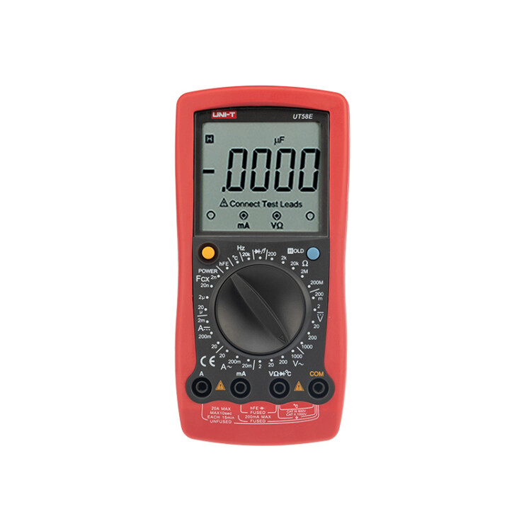 UT58E — это профессиональный мультиметр с современным и эргономичным дизайном. Выделяется из серии приборов UT 58 разрешением дисплея 4 с половиной разряда и самой низкой базовой погрешностью, что делает его наиболее точным. У всех остальных мультиметров этой серии разрешение дисплея составляет три с половиной разряда.