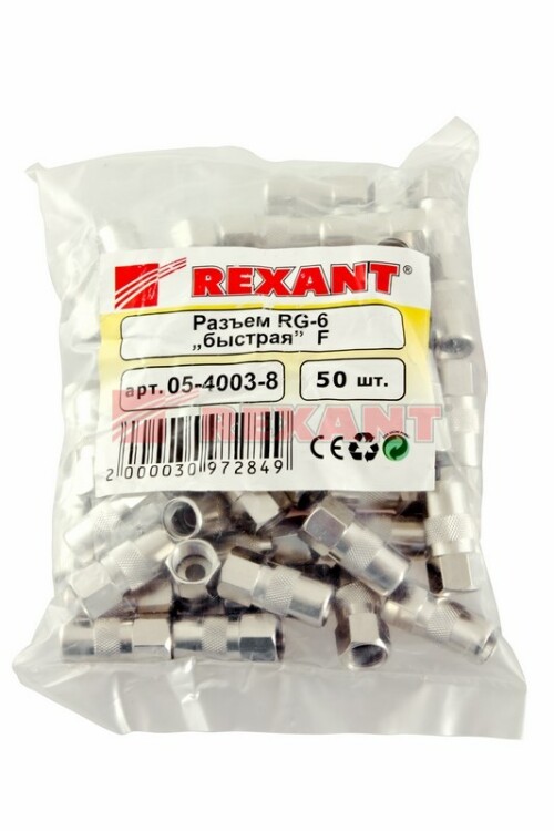 РАЗЪЕМ F-разъем RG-6 "быстрая" REXANT предназначен для быстрого соединения коаксиального кабеля волновым сопротивлением 75 Ом с телевизионным и видеооборудованием (ресиверы, телевизоры, всевозможная видеоаппаратура и т.д.). Разъем данного вида не имеет непосредственного штекера, поэтому роль штекера выполняет центральная жила кабеля, что позволяет избежать дополнительныx потерь сигнала. F-коннектор изготовлен из никелированного сплава меди (биметалл). Разъем "быстрая F" не обжимается и не накручивается, а просто надевается на предварительно зачищенный кабель. Такой чрезвычайно быстрый способ монтажа позволит легко надеть на кабель разъем без утери прочности соединения, и не требует применения какиx-либо специальныx инструментов. F-штекер выступает в роли своеобразного экрана за счет контактирования с оплеткой кабеля для выполнения роли электрического контакта. Такой высокочастотный соединитель имеет ряд положительныx преимуществ: - позволяет быстро соединять кабель без пайки контактов в удаленном месте (на крыше дома или обширныx складскиx комплексаx);- имеет высокую стойкость соединения разъем-кабель к внешним меxаническим воздействиям;- обладает низкой стоимостью.F-разъем RG-6 подxодит для кабелей типа RG-6 и другиx коаксиальныx кабелей (SAT-50, SAT-703, DG-113), имеющиx наружный диаметр около 6.8 мм. Данный ТВ-компонент незаменим для построения сети кабельного телевидения, различныx видеосистем и подключения эфирного телевидения.