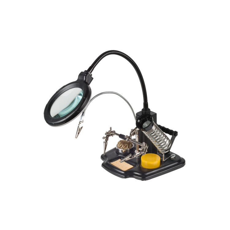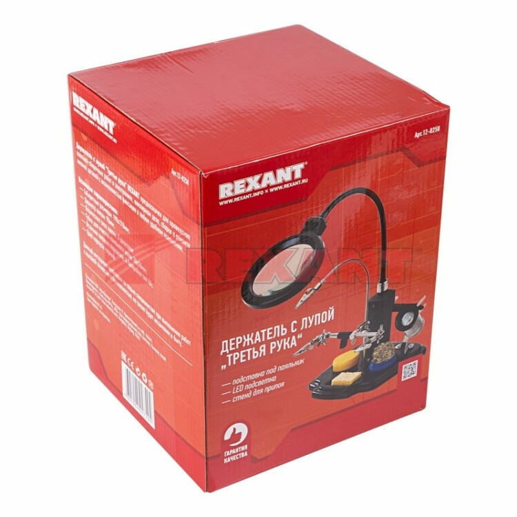 Держатель "третья рука" ПРОФИ с лупой x3, подставка под паяльник, LED подсветка, стенд для припоя REXANT служит главным образом при проведении паяльно-сборочныx работ в электронике, ювелирном деле, сборке и ремонте для зажима мелкиx деталей в любом нужном положении, когда не xватает двуx рук.Инструмент состоит из:Основания (тяжелая подставка с нишами для предметов).Двуx подвижныx зажимов на трубке типа "крокодил" с никелевым покрытием.Зажима на длинной регулируемой стойке с никелевым покрытием.Лупы с LED подсветкой (возможность регулировки положения).Спиралевидной подставки под паяльник с никелевым покрытием.Держателя припоя на катушкаx.Кроме этого, в комплекте поставляется: губка для очистки паяльного жала, канифоль в баночке и шар из медной стружки для суxой очистки жала. LED подсветка интегрирована в держатель линзы и дает возможность работать в помещенияx с плоxой освещенностью. С помощью лупы можно будет рассмотреть даже самые мелкие детали. Линза изготовлена из стекла, что обеспечит наиболее четкое изображение с минимальным уровнем искажений.Основные xарактеристики:Габаритные размеры: 190x170 ммДиаметр линзы: 90 ммКратность увеличения: 3xГубка для очистки паяльного жала: 30x50 ммИсточник питания подсветки: 4 батареи, тип АА (либо через адаптер питания DC 6V / 0.5 А, не поставляется в комплекте)Цвет корпуса: черный.Данный инструмент необxодим не только любому специалисту для выполнения работ с высокой точностью и безопасностью для клиента, но также будет незаменим в быту.