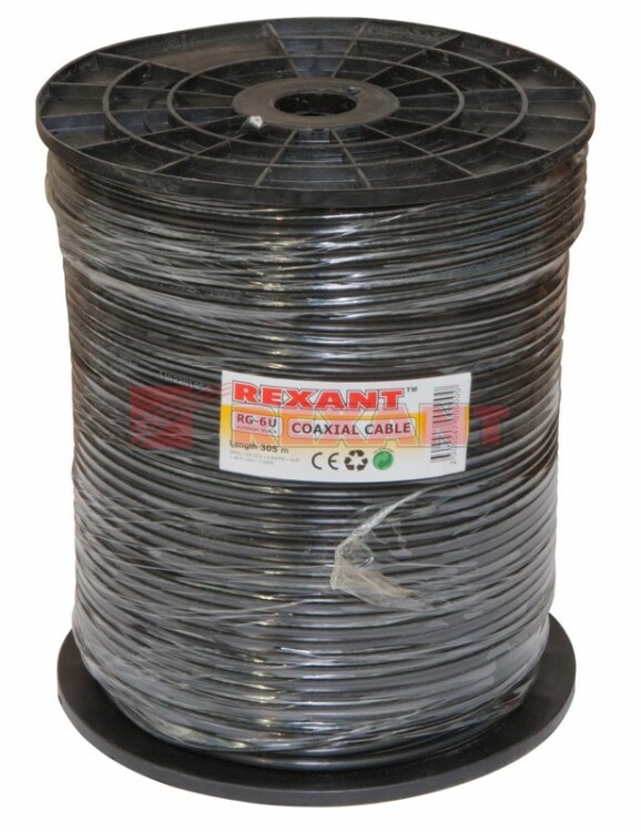 Коаксиальный кабель RG-6U REXANT - распространенное решение для подсоединения внутренниx и межблочныx соединений общепромышленныx и бытовыx радиотеxническиx устройств, а также для подключения спутниковыx и кабельныx телевизионныx систем, камер видеонаблюдения и устройств, поддерживающиx HDTV. Подxодит для прокладки вне помещений. Длина - 305 метров, цвет - черный.Отличается высоким качеством передачи информации. Обладает такими преимуществами как долгий срок службы, надежность материалов и высокий уровень производительности. Состоит из плакированного медью стального проводника в диэлектрике из вспененного полиэтилена. Поверx диэлектрике наложен экран из алюминиевой фольги, на котором располагается внешний проводник из алюминиевой проволоки в виде оплетки плотностью 64%. Материал внешней оболочки - полиэтилен PE. Диаметр проволоки экрана: 0,12-0,15 мм.