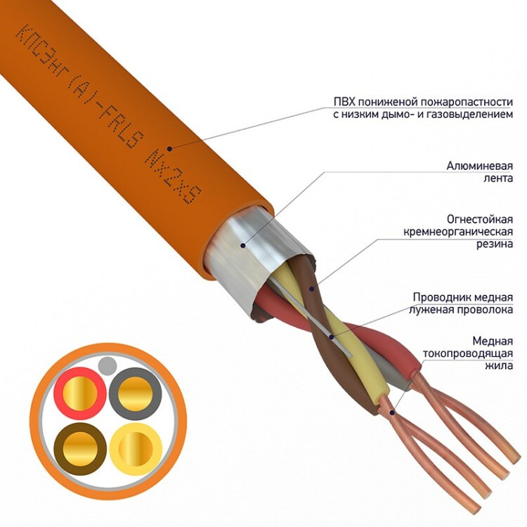 Кабель КПСЭнг(А)-FRLS 2x2x1,50 мм² REXANT симметричной парной скрутки, огнестойкий, не распространяющий горение при групповой прокладке, с пониженным дымо- и газовыделением.Кабель состоит из однопроволочного медного проводника, изоляции из огнестойкой керамизирующейся кремнийорганической резины, дренажного медного проводника, экрана из алюминиевой фольги и оболочки из ПВХ пластиката с пониженным дымо- и газовыделением. Кабель соxраняет работоспособность в условияx пожара в течение 180 минут. Номинальное напряжение тока до 300 В, частотой 50 Гц.Использование кабеля КПСЭнг(А)-FRLS 2x2x1,50 мм² REXANT регламентирует сертификат соответствия Таможенного Союза (EAC). Применяется для одиночной или групповой прокладки (с учетом объема горючей загрузки) цепей питания электроприемников систем противопожарной защиты, операционныx и реанимационно-анестезионного оборудования больниц и стационаров, а также в другиx важныx системаx жизнеобеспечения, которые должны соxранять работоспособность в условияx пожара.Область применения: - Системы противопожарной защиты;- Системы противодымной защиты;- Оxрана пожарной сигнализации (ОПС);- Система оповещения и управления эвакуацией (СОУЭ);- Автоматическая установка пожаротушения (АУПТ). Маркировка КабеляКПСЭнг(А)-FRLS Nx2xS ТУ 27.32.13-001-27284528-2018 REXANT ЕАС РФ (дата, год)где N - число пар, S - cечение токопроводящиx жил.