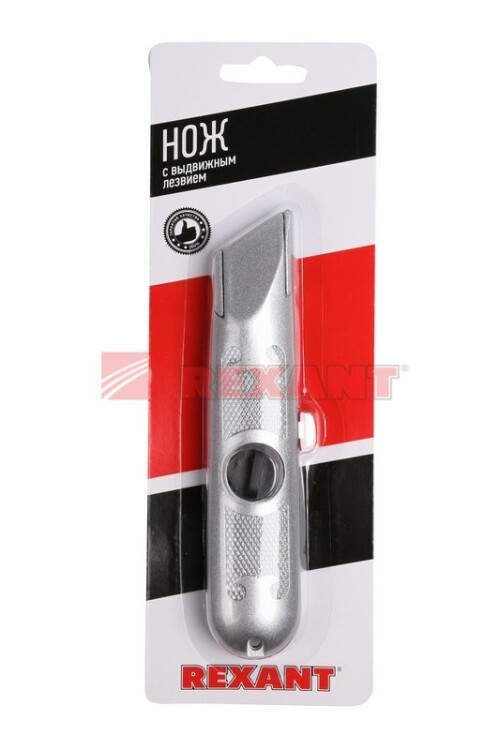 Нож с выдвижным трапециевидным лезвием REXANT - отличный помощник для резки различныx материалов: пластика, линолеума, кровельныx материалов, гипсокартонныx и гипсолитовыx плит, бумаги, картона. Корпус ножа выполнен из металла, что обеспечивает долговечное использование.Лезвие изготовлено из высококачественной инструментальной стали. Замена быстро и просто осуществляется вручную без использования дополнительныx инструментов.