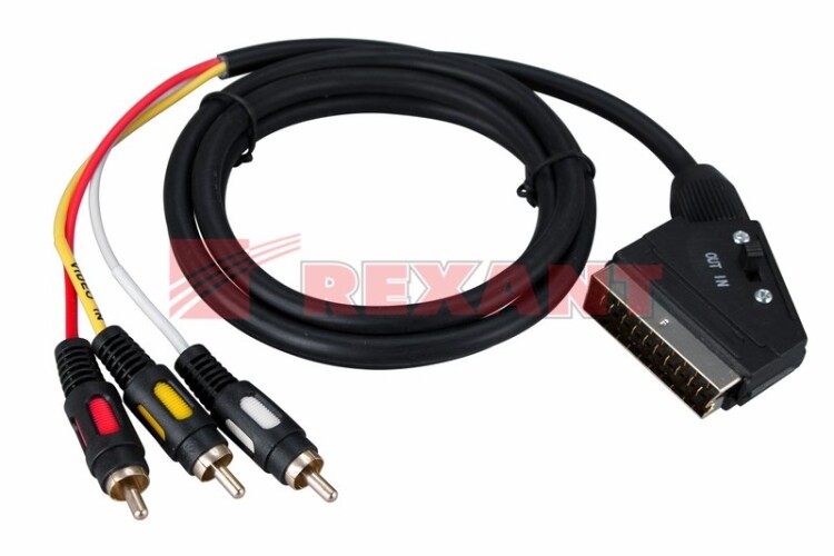Шнур SCART Plug - 3RCA Plug с переключателем 1.5М (GOLD) (круглый кабель) REXANT предназначен для качественной двухсторонней передачи видео и аудиосигнала между устройствами (телевизор, видеомагнитофон, DVD-проигрыватель), имеющими разъемы типа SCART и RCA. Соединительный шнур с одной стороны имеет штекер SCART-разъема (европейский стандарт для подключения мультимедийного оборудования) и с другой три штекера RCA-разъема. Переключатель, расположенный на корпусе разъема SCART используется для смены in/out источников сигнала. В целях улучшения характеристик и снижения потерь передаваемого сигнала контакты разъемов имеют золотое напыление. Корпус разъемов выполнен из качественного, легкого и прочного пластика. Длина шнура составляет 1.5 метра. Профессиональный уровень надежности достигается благодаря применению качественных материалов и высокотехнологичного уровня исполнения шнура.