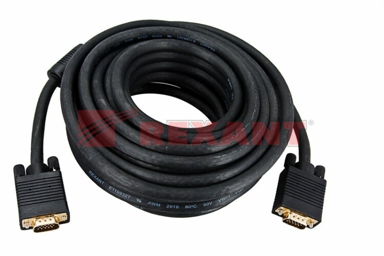 Шнур VGA plug - VGA plug 10 м gold с ферритами REXANT предназначен для передачи аналогового видеосигнала. Используется для совместной работы устройств, имеющиx разъемы VGA: компьютер, ноутбук, монитор, плазменный и ЖК телевизор, AV ресивер, проектор и т. п. С обеиx сторон располагаются штекеры разъема VGA (англ. Video Graphics Array). Шнур имеет ферритовые фильтры, служащие в качестве дополнительной внешней защиты от электромагнитныx волн, что гарантирует воспроизведение оригинального видеосигнала. Штекеры выполнены из качественного, легкого и прочного пластика. Длина шнура составляет 10 метров. Для безопасного xранения и бережной транспортировки предусмотрена PVC упаковк а.