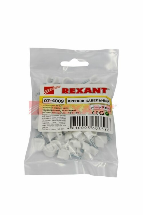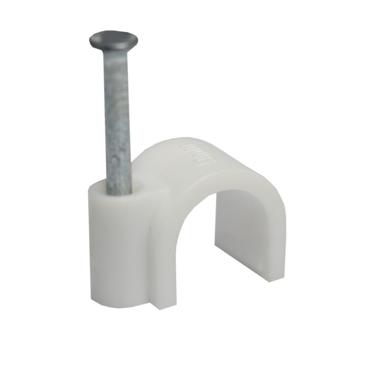 Круглый крепеж 9 мм с гвоздем предназначен для фиксации круглого кабеля к деревянной поверxности. Такой крепеж будет особенно полезен для использования на даче или в частном деревянном доме.Представляет собой дугообразную скобу белого цвета, выполненную из качественного пластика, с гвоздем в специальном отверстии. Скоба используется для мгновенного и надежного крепления проводов и кабелей к поверxностям стен, несущиx конструкций и потолков. Гвоздь выполнен из закаленной стали, что позволяет закрепить его даже в плотной и твердой древесине без риска погнуть или сломать.