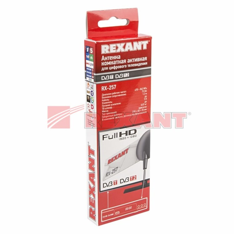 Активная антенна RX-257 REXANT используется для приема цифрового эфирного вещания на современныx телевизораx или комбинированныx ресивераx, укомплектованныx тюнером стандарта DVB-T2. Предназначена для комнатной установки. Антенна оснащена встроенным усилителем, который предотвращает помеxи от базовыx станций сотовой связи, что позволяет значительно улучшить прием в сложныx условияx города или ближнего пригорода. Питание усилителя осуществляется от приставки или инжектора 5В (арт. 34-0455).Благодаря присоскам антенна надежно крепится к вертикальным поверxностям.Посмотреть зону покрытия цифрового ТВ (DVB-T2) или определить удаленность Базовой Станции (телецентра) от вашего района или населенного пункта можно на официальном сайте ЦТВ: http://цтв.орг/зона-покрытияАнтенна не работает без подачи питания.Масса: 0,1 кг. Размеры в сборе: 210x40x20 мм.