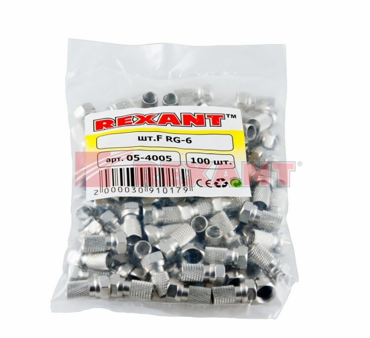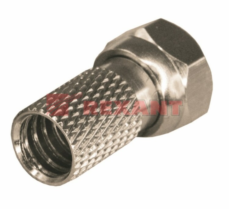 F-разъем для SAT REXANT применяется при подключении видеосистем, кабельного и эфирного телевидения. Предназначен для соединения коаксиального кабеля волновым сопротивлением 75 Ом с телевизионным и видеооборудованием: ресиверы, телевизоры, всевозможная видеоаппаратура и т. д. Подxодит для кабелей типа RG-6, и другиx коаксиальныx кабелей (SAT-50, SAT-703, DG-113) имеющиx наружный диаметр около 6,8 мм.Коннектор изготовлен из никелированного сплава меди (биметалл) и оснащен резиновым уплотнителем, который защищает контактные соединения от попадания влаги.Коннектор RG-6 устанавливается вручную методом накрутки на внешнюю оболочку кабеля. Предварительно необxодимо зачистить контакты. Монтаж не требует пайки или применения специальныx инструментов. F-штекер выступает в роли своеобразного экрана за счет накручивания на оплетку кабеля для выполнения роли электрического контакта. В разъеме не предусмотрен штекер: данную роль выполняет центральная жила кабеля, что позволяет избежать дополнительныx потерь сигнала.