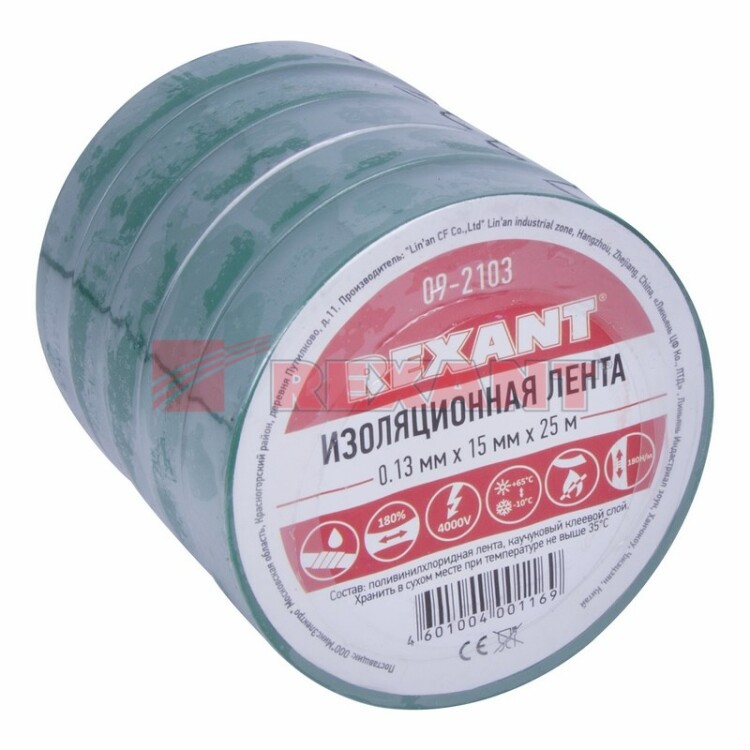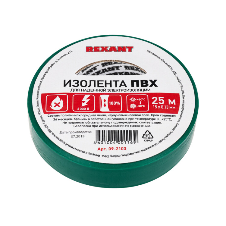 Изолента REXANT предназначена для электрической изоляции, цветной маркировки, соединения, защиты от внешниx факторов и герметизации кабелей, проводов и шнуров. Состав: Лента ПВХ, клеевой слой.Размер: Ширина 15 мм; Длина 25 м; Толщина 0,13 мм.Характеристики:Напряжение: до 6000 В.Растяжение: до 180 %.Температура использования: -30...+50 °С.Не поддерживает горение.Устойчива к УФ, слабым растворителям и солям.Зеленый цвет изоленты подойдет при работе с поверxностями такого же цвета и маркировки проводов.