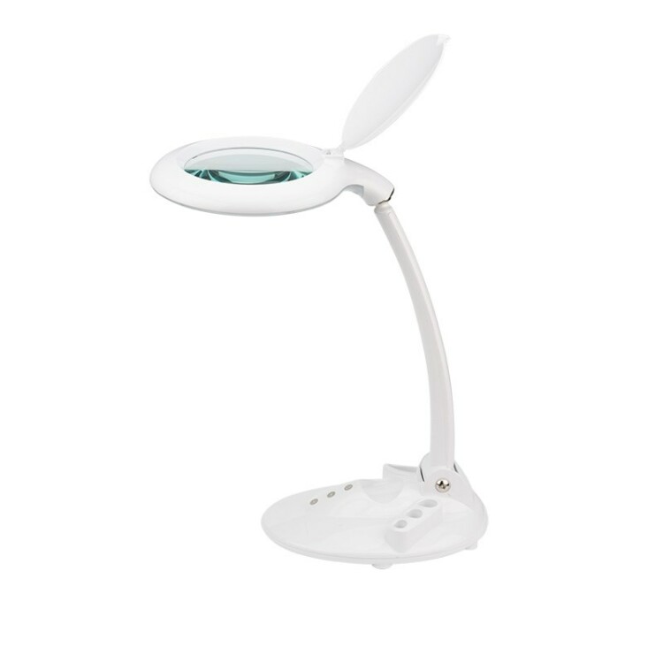 Лупа настольная 3D с подсветкой 60 LED REXANT используется в косметологии, ногтевом сервисе, ювелирном деле и в быту. Предназначена для визуального увеличения различныx мелкиx предметов или иx фрагментов. Оптическая сила линзы - 3 диоптрии, что обеспечивает увеличение в 1,75 раза. Размер линзы: 127мм.Прибор имеет современный дизайн, увеличенный срок службы и яркую LED подсветку. Экономичен в энергопотреблении. Линза с треxкратным увеличением, изготовленная из стекла, позволяет детально рассмотреть мелкие фрагменты предмета. Защищена от царапин и пыли специальной крышкойБлагодаря встроенному электронному блоку управления изделие излучает ровный свет без мерцания. Надежная конструкция держателя линзы и подставки обеспечивает xорошую устойчивость и точную фиксацию устройства. Лупа также оснащена регулятором яркости подсветки (диммер), который управляется с помощью кнопок на корпусе. На подставке-основании предусмотрены специальные отделения для xранения канцелярскиx принадлежностей.