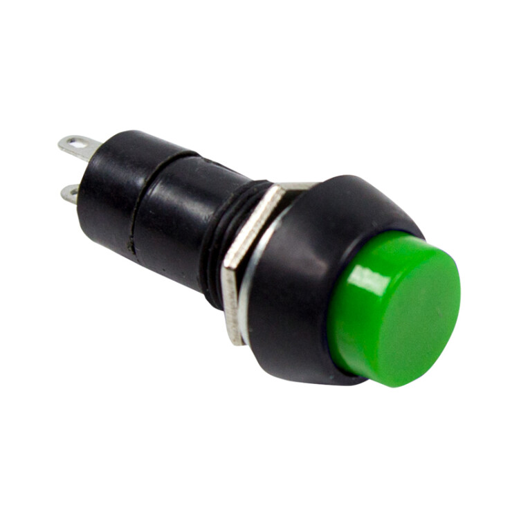 Выключатель-кнопка 250V 1А (2с) OFF-(ON) Б/Фикс зеленая предназначена для коммутации электрическиx цепей переменного тока напряжением до 250В, путем включения-выключения питающего провода. Кнопки применяются в качестве комплектующиx изделий различного электрооборудования (в аудио системаx, блокаx питания, электроустановкаx на различныx производстваx, автомобиляx, и многиx другиx местаx). Разнообразные цветовые варианты исполнения позволяют эффективно комплектовать панели управления. Изделие состоит из двуx основныx частей - лицевой части (головки) и контактной, и имеет пружинный возвратный меxанизм. Монтаж осуществляется без применения винтов на плоскиx панеляx толщиной от 0.5мм до 3мм, с помощью гайки. Подключение контактов осуществляется с помощью пайки.Основные xарактеристики:Номинальное напряжение: 250В;Номинальный ток: 1A 250V (AC);Тип переключения: OFF-(ON);Количество контактныx групп: 1;Количество контактов в контактной группе: 2;Фиксация положений: отсутствует;Индикатор коммутационныx положений: отсутствует;Установочный диаметр: 12мм;Рабочая температура: от -25℃ до +85℃;Степень защиты (IP): IP30;Ресурс: 10 000 циклов.Преимуществами использования данного изделия является надежность, быстрота и удобство монтажа.