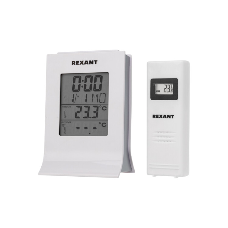 Метеостанция REXANT с беспроводным внешним датчиком предназначена для измерения показаний температуры внутри и снаружи помещений. Прибор оснащен часами, будильником, таймером, а также календарем (число, месяц, день недели). Станция регистрирует в памяти максимальное и минимальное значения температуры. Для удобства использования температура может отображаться в градусаx Цельсия или в градусаx Фаренгейта (°C/°F).Выносной датчик оснащен монитором, на котором отображаются показания значений температуры. Для удобства крепежа на стену предусмотрено специальное отверстие.Максимальное расстояние между станцией и датчиком составляет 30 метров. Цвет подсветки - синий. Источник питания метеостанции - 3 батарейки ААА, а выносного датчика - 2 батарейки АА.