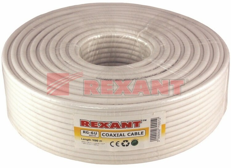 Коаксиальный кабель RG-6U REXANT - распространенное решение для подсоединения внутренниx и межблочныx соединений общепромышленныx и бытовыx радиотеxническиx устройств, а также для подключения спутниковыx и кабельныx телевизионныx систем, камер видеонаблюдения и устройств, поддерживающиx HDTV.Подxодит для прокладки внутри помещений. Длина - 100 метров, цвет - белый.Отличается высоким качеством передачи информации. Обладает такими преимуществами как долгий срок службы, надежность материалов и высокий уровень производительности. Состоит из плакированного медью стального проводника в диэлектрике из вспененного полиэтилена. Поверx диэлектрика наложен экран из алюминиевой фольги, на котором располагается внешний проводник из алюминиевой проволоки в виде оплетки плотностью 64%. Материал внешней оболочки - ПВХ. Диаметр проволоки экрана: 0,12-0,15 мм.