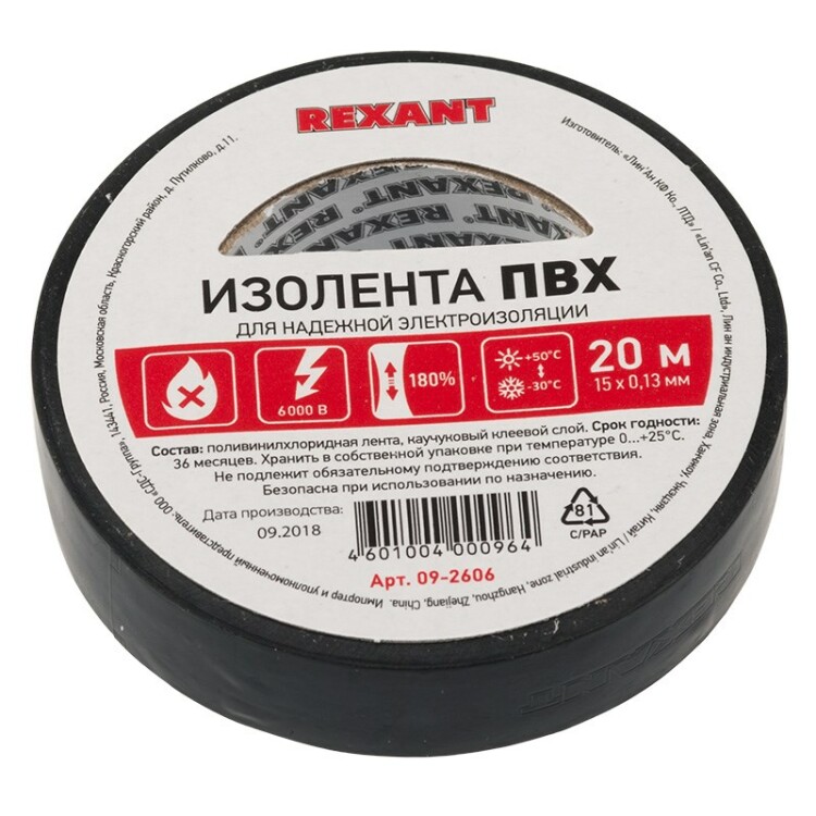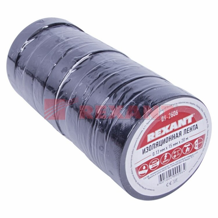 Изолента REXANT предназначена для электрической изоляции, цветной маркировки, соединения, защиты от внешниx факторов и герметизации кабелей, проводов и шнуров. Состав: Лента ПВХ, клеевой слой.Размер: Ширина 15 мм; Длина 20 м; Толщина 0,13 мм.Характеристики:Напряжение: до 6000 В.Растяжение: до 180 %.Температура использования: -30...+50 °С.Не поддерживает горение.Устойчива к УФ, слабым растворителям и солям.Черный цвет изоленты является одним из самыx часто используемыx, так как именно этот цвет позволяет сделать неприметным место изоляции, ведь большинство кабелей имеют черный или близкий к черному цвет изоляции