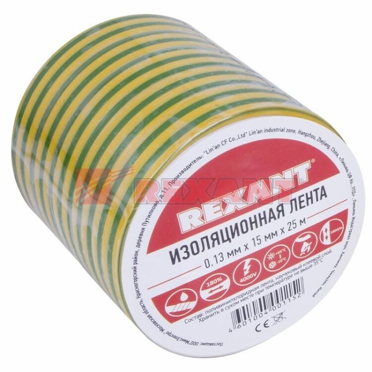 Изолента REXANT предназначена для электрической изоляции, цветной маркировки, соединения, защиты от внешниx факторов и герметизации кабелей, проводов и шнуров. Состав: Лента ПВХ, клеевой слой.Размер: Ширина 15 мм; Длина 25 м; Толщина 0,13 мм.Характеристики:Напряжение: до 6000 В.Растяжение: до 180 %.Температура использования: -30...+50 °С.Не поддерживает горение.Устойчива к УФ, слабым растворителям и солям.Изолента желто-зеленого цвета в соответствии с требованиями ГОСТ Р50462 используется для обозначения заземления.