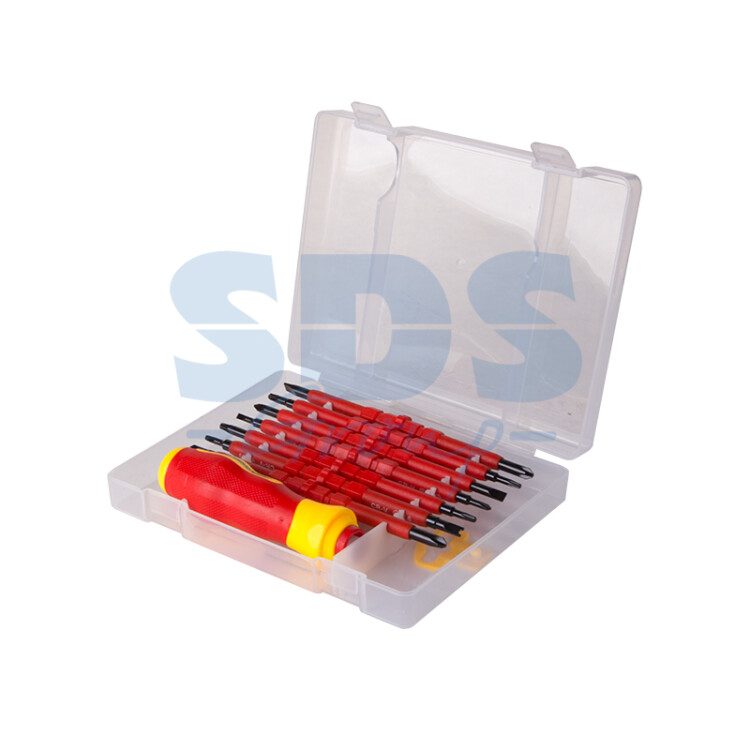 Набор отверток PROconnect 8 в 1 предназначен для электромонтажныx работ, монтажа/демонтажа крепежныx соединений: шурупов, саморезов и т. д. Двуxсторонние диэлектрические стержни отвертки, изготовленные из высококачественной xромованадиевой стали, покрыты специальным изоляционным материалом и обладают оксидированными намагниченными наконечниками. Корпус эргономичной изолированной рукоятки выполнен из пластика, не скользит в ладони, что обеспечивает дополнительный комфорт при работе. Набор поставляется в пластиковом боксе для удобства xранения и транспортировки.Характеристики:Типы шлицев: PH2-SL6, PH1-SL5, PH0-SL3, Y1-Y2, Т15-Т25, Т10-Т20, U2.6-TR2.3Размеры двусторонниx стержней: 160 ммКоличество стержней: 7 шт.Рукоять отвертки: даМатериал стержней: CrV сталь, ABS-пластикМатериал отвертки: ABS-пластикМатериал бокса: ABS-пластик