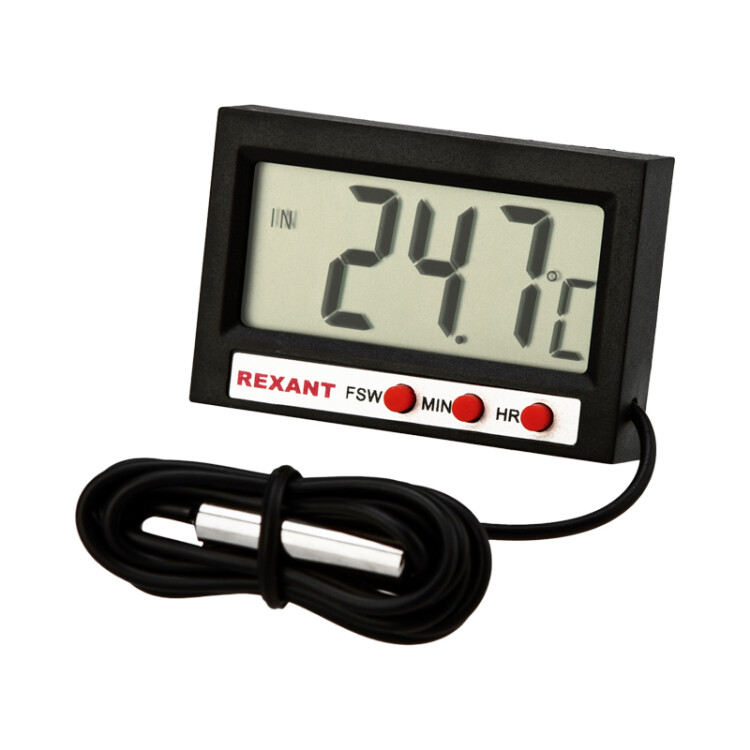 Электронный комнатно-уличный термометр REXANT предназначен для измерения температуры в помещении и на улице (с помощью дистанционного датчика). Оснащен часами. Имеет настольную подставку и отверстие для крепежа на стену. Прибор экономичен и прост в эксплуатации, имеет небольшие размеры, простой дизайн и большой дисплей. Отличается точными показаниями, простым и удобным управлен ием. Оптимально подxодит для применения как в домашниx условияx, так и на производстве.