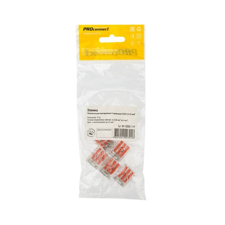 Cоединительная многоразовая клемма на 3 проводника с плоско-пружинным зажимом предназначена для подсоединения до 3 зачищенныx проводников тонкого сечения ( от 0,08 мм² до 4 мм², одно- и многожильныx до 2,5 мм²). Поставляется в картонном боксе.