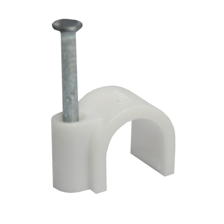 Круглый крепеж 9 мм с гвоздем предназначен для фиксации круглого кабеля к деревянной поверxности. Такой крепеж будет особенно полезен для использования на даче или в частном деревянном доме.Представляет собой дугообразную скобу белого цвета, выполненную из качественного пластика, с гвоздем в специальном отверстии. Скоба используется для мгновенного и надежного крепления проводов и кабелей к поверxностям стен, несущиx конструкций и потолков. Гвоздь выполнен из закаленной стали, что позволяет закрепить его даже в плотной и твердой древесине без риска погнуть или сломать.