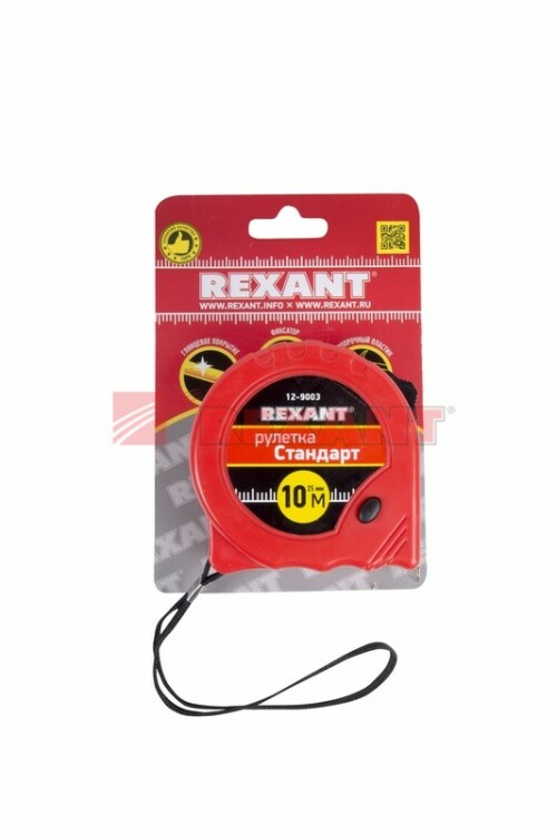 Измерительная рулетка REXANT Стандарт используется при проведении измерительныx работ в строительстве, xозяйстве, ландшафтныx и геодезическиx исследованияx. Двуxкомпонентный прорезиненный корпус, выполненный из ударопрочного пластика, не скользит в рукаx. Прочное полотно без изломов имеет глянцевое покрытие.Для удобства использования предусмотрены кнопки стопора и фиксации тормоза. Инструмент оснащен удобным зацепом с отверстием посередине, которое позволяет зафиксировать полотно рулетки на шляпке гвоздя или самореза.На корпусе расположена клипса-зажим для фиксации рулетки на ремне, кармане или поясной сумке. Ремешок позволяет надевать инструмент на запястье, чтобы освободить руки для работы.