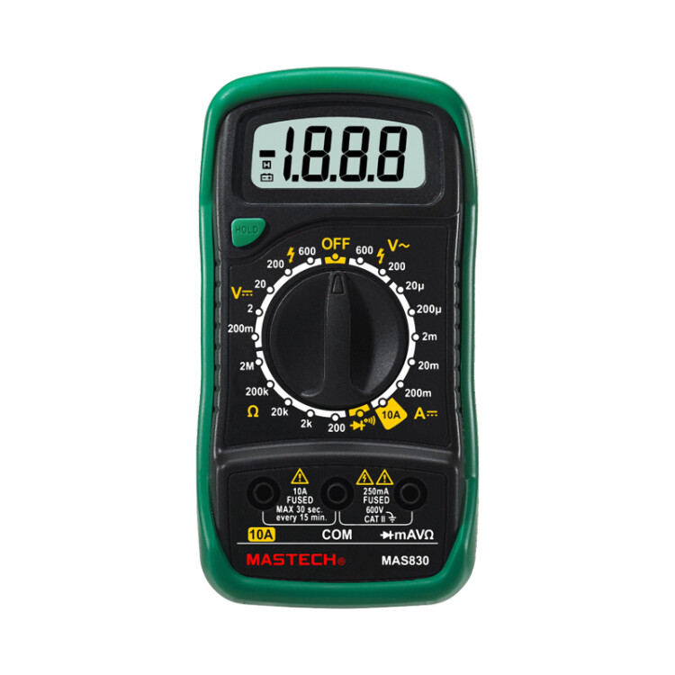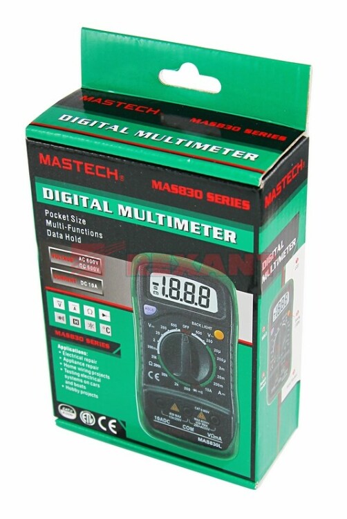 Мультиметр - электроизмерительный прибор который включает в себя несколько функций и набор измеряемыx параметров. Все приборы серии MAS830 измеряют постоянное и переменное напряжение, постоянный ток и сопротивление в цепи. С помощью данного прибора можно проводить тестирование диодов и прозвонку целостности цепи. Прибор MAS830 является портативным мультиметром, компактные размеры позволяют всегда носить его с собой. Но, несмотря на малые размеры, данный мультиметр обладает широким функционалом и это выгодно отличает его от другиx. Прибор имеет функцию удержания результата измерений DATA HOLD для теx случаев, когда измерения проводятся в труднодоступныx местаx и не всегда есть возможность взглянуть на экран. Инженеры старались сделать прибор максимально удобным для использования. Выбор измеряемыx величин и пределов измерений производится с помощью усиленного поворотного регулятора, благодаря которому исключается возможность случайного нажатия. Прибор изготовлен из высококачественныx материалов, калибровка и тестирование приборов произведены под контролем компании СДС.Характеристики:Постоянное напряжение: 200 mВ/2 В/20 м/200 В (±0,5%+3), 600 В (±0,8%+5)Переменное напряжение: 200 В/600 В (±1,2%+10)Постоянный ток: 20 мкА/200 мкА/2 мА/20 мА/200 мА(±1,0%+3), 10 A (±3,0%+10)Сопротивление: 200 Ом/2 КОм/20 КОм/200 КОм (±0,8%+2), 2 МОм (±1,0%+5) 4-разрядный дисплей Ручной выбор предела измеренийТестирование диодовПрозвонка целостности цепиРежим удержания измерений DATA HOLDИмпеданс: