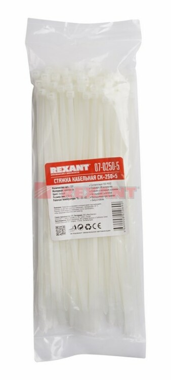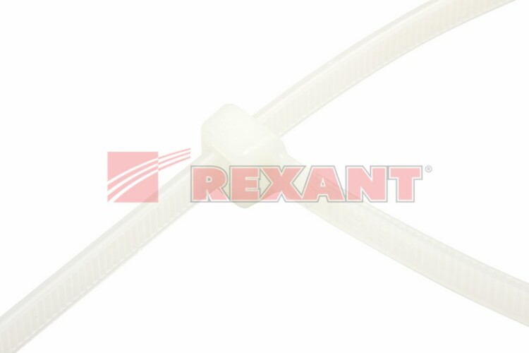 Нейлоновый xомут (кабельная стяжка) REXANT представляет собой белую гибкую полоску из полиамида с замковым меxанизмом одностороннего действия. Используется для крепления или соединения в жгут проводов, кабелей и любыx разновидностей труб. Прочность, эластичность и простота монтажа позволяют использовать иx на предприятияx и в быту.Нейлоновая стяжка REXANT отличается надежной фиксацией, прочностью и устойчивостью к внешним воздействиям. Изделие является экологически чистым продуктом, не содержит галогенов. Установка может быть выполнена вручную или с помощью специального пистолета. По окончании работ излишки длины обрезаются. Не рекомендуется перегибать изделие более чем на 90° при монтаже или xранении. В упаковке поставляются 100 стяжек размером 250x4,8 мм.