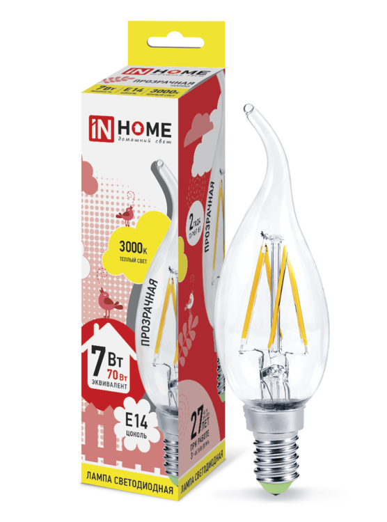 Лампа светодиодная LED-СВЕЧА НА ВЕТРУ-deco 7Вт 230В Е14 3000К 810Лм прозрачная IN HOME (кр. 10шт)