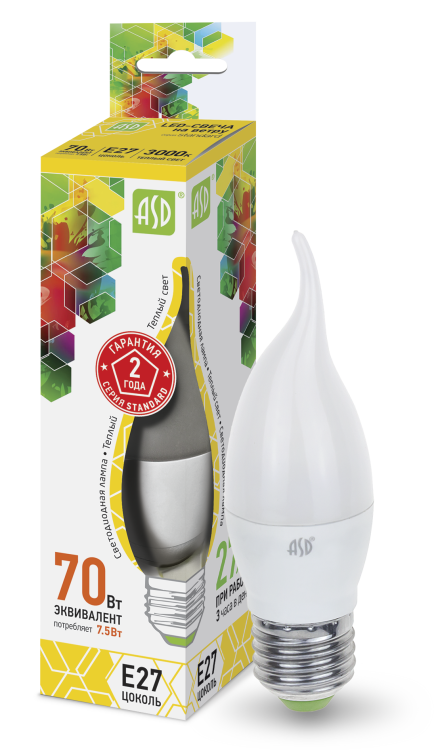 Лампа светодиодная LED-СВЕЧА НА ВЕТРУ-standard 7.5Вт 230В Е27 3000К 675Лм ASD (кр.10шт)