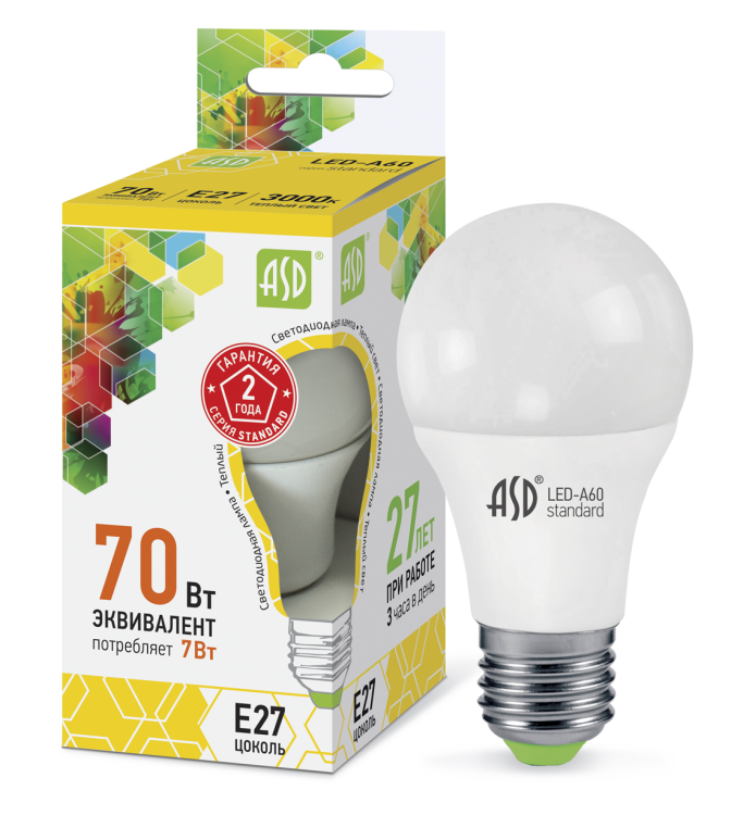 Лампа светодиодная LED-A60-standard 7Вт 230В Е27 3000К 630Лм ASD (кр.10шт)
