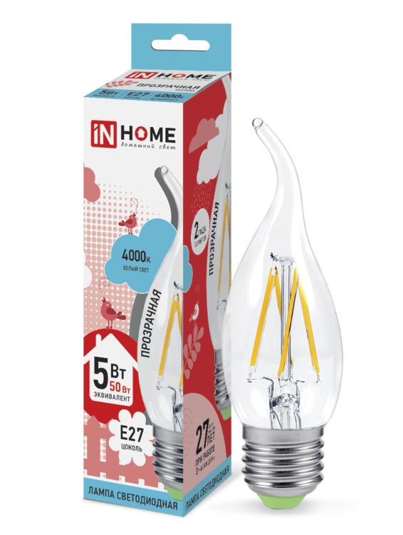 Лампа светодиодная LED-СВЕЧА НА ВЕТРУ-deco 5Вт 230В Е27 4000К 450Лм прозрачная IN HOME (кр.50шт)
