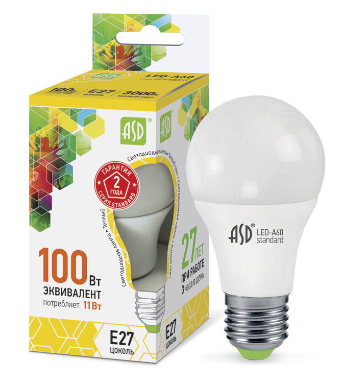 Лампа светодиодная LED-A60-standard 11Вт 230В Е27 3000К 990Лм ASD (кр.10шт)
