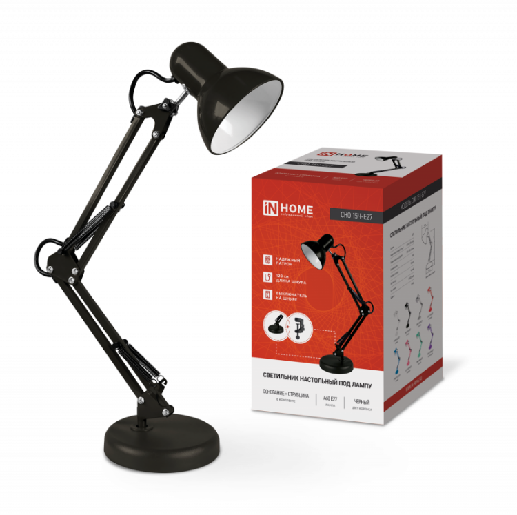 Светильник настольный под лампу на основании + струбцина СНО 15Ч 60Вт E27 230В ЧЕРНЫЙ IN HOME (кр. 1шт)