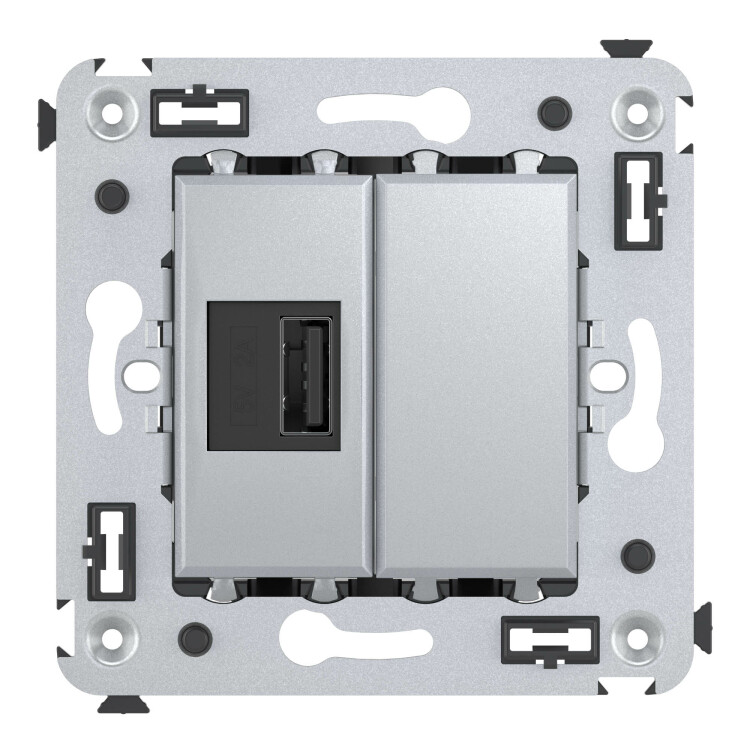 USB зарядное устройство в стену. Назначение: Назначение: для монтажа в подрозеточные коробки глубиной не менее 45 мм (код 59301); используется для подзарядки электронных гаджетов. Характеристики: винтовые зажимы; номинальное напряжение – 220 В; частота – 50–60 Гц; напряжение на выходе – 5 В; номинальный ток на каждом выходе - 2,1 А. Кол-во модулей: 2. Цвет: Закаленная сталь". Производитель оставляет за собой право вносить во внешний вид изделия изменения, которые не влияют на его функционал, безопасность и надежность.